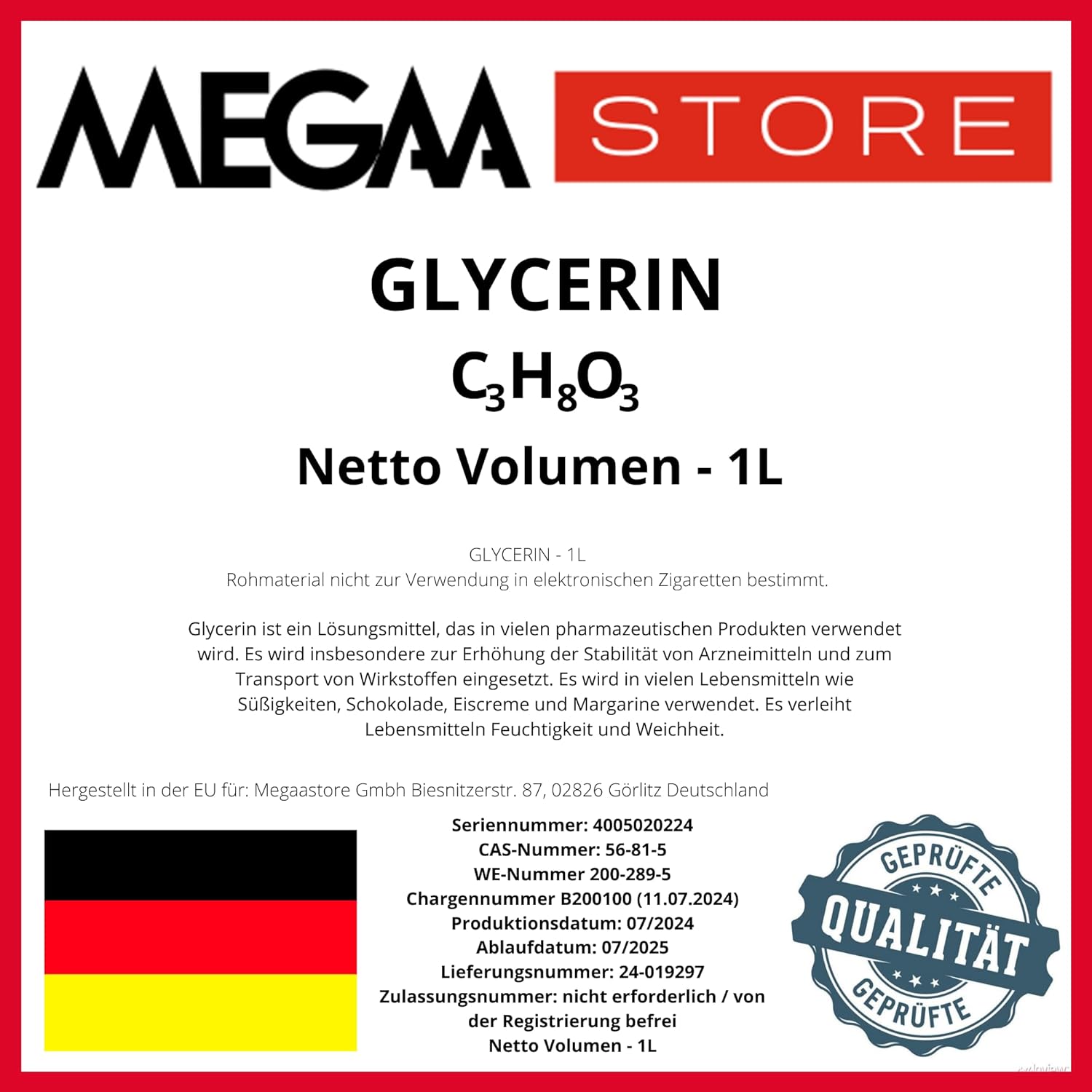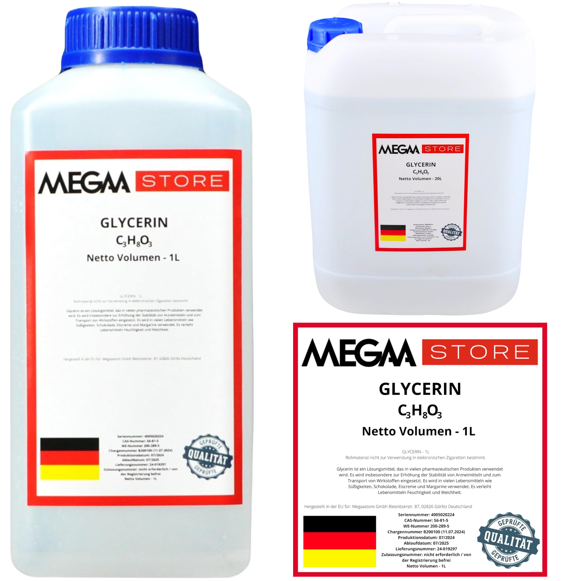 Das Produkt wird in verschiedenen Packungsgrößen angeboten, um den unterschiedlichen Anforderungen gerecht zu werden. Unsere Optionen umfassen: 1 l (1-Pack), 1 l (3-Pack), 1 l (6-Pack), 5 l (1-Pack), 5 l (2-Pack), 10 l (1-Pack) und 20 l (1-Pack). Diese Packungsgrößen machen es einfach, Glycerin je nach Bedarf zu erwerben. Besonders für industrielle Anwendungen oder Laborbedarf bietet unsere große Auswahl an Packungen eine flexible Lösung. Glycerin 99,5% eignet sich nicht nur für die Kosmetik- und Seifenindustrie, sondern auch für den Einsatz in Haushalten und gewerblichen Anwendungen. Es kann zum Beispiel für Reinigungszwecke oder als Lösungsmittel in verschiedenen chemischen Prozessen verwendet werden.