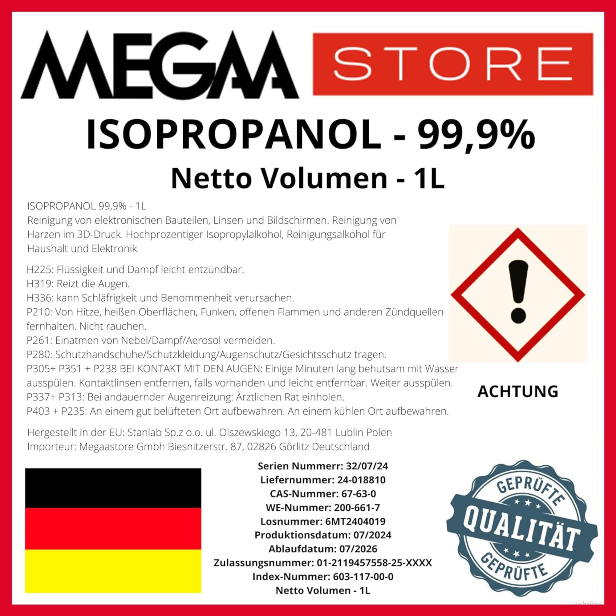 - Hochreine Qualität: Enthält 99,9 % reinen Isopropylalkohol ohne Verunreinigungen.