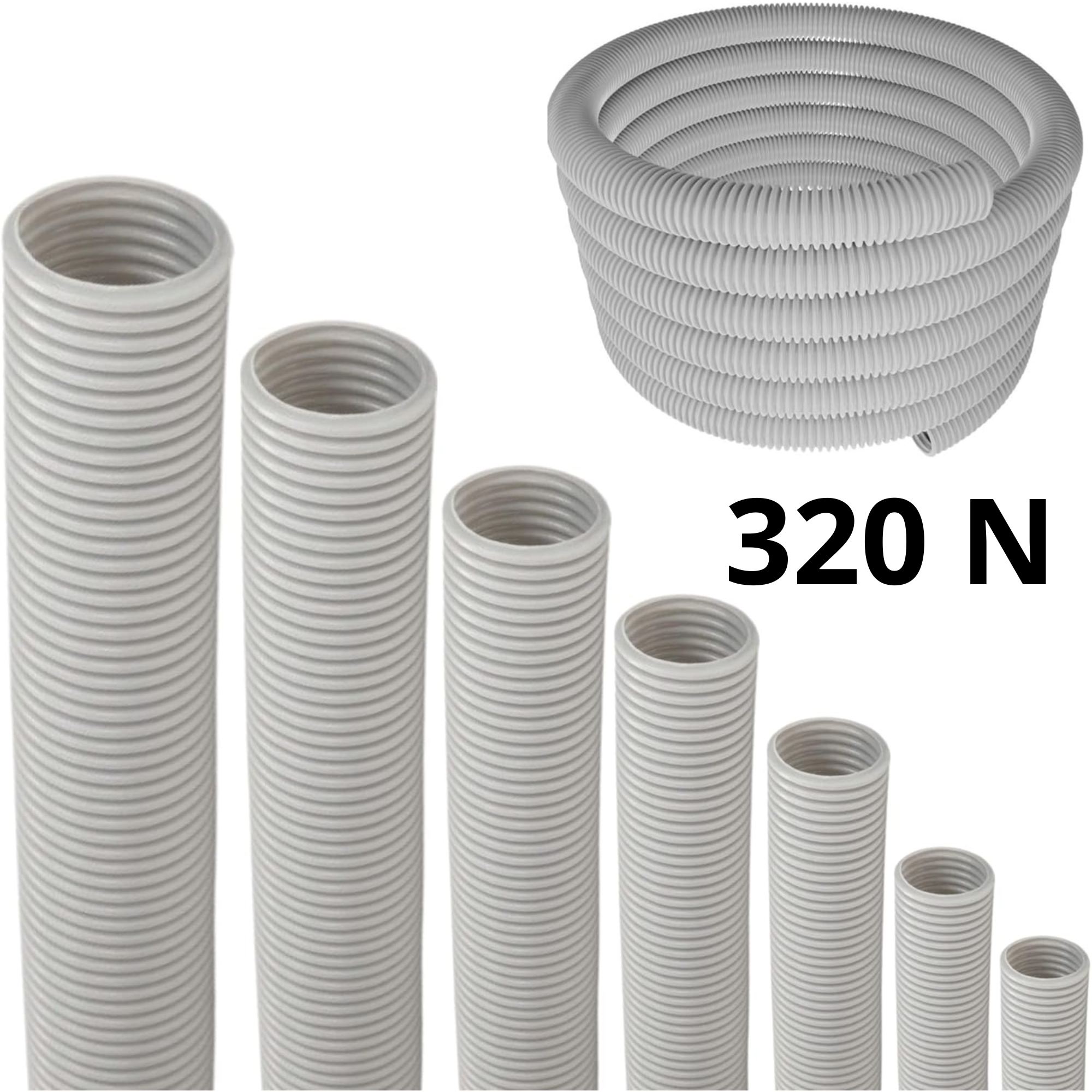 - Ungeschnittenes Polyvinylchlorid (PVC)-Wellrohr ist ein universeller Wellschlauch mit sehr guter Biegefestigkeit von 320 N. UV-beständig und schwer entflammbar